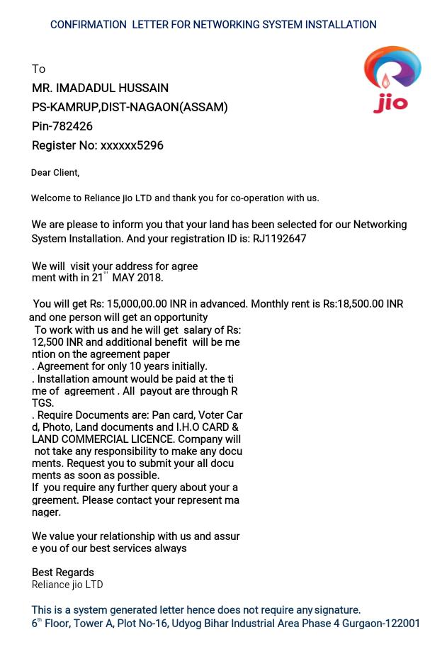 Fraud By Jio Tower Installation Team Info Jiotower Org In Hapur Jago Grahak Jago - Regards, jiotoweronline.info reliance jio infocomm limited rd 3 floor,b wing fortune buildind bharat nagar.
